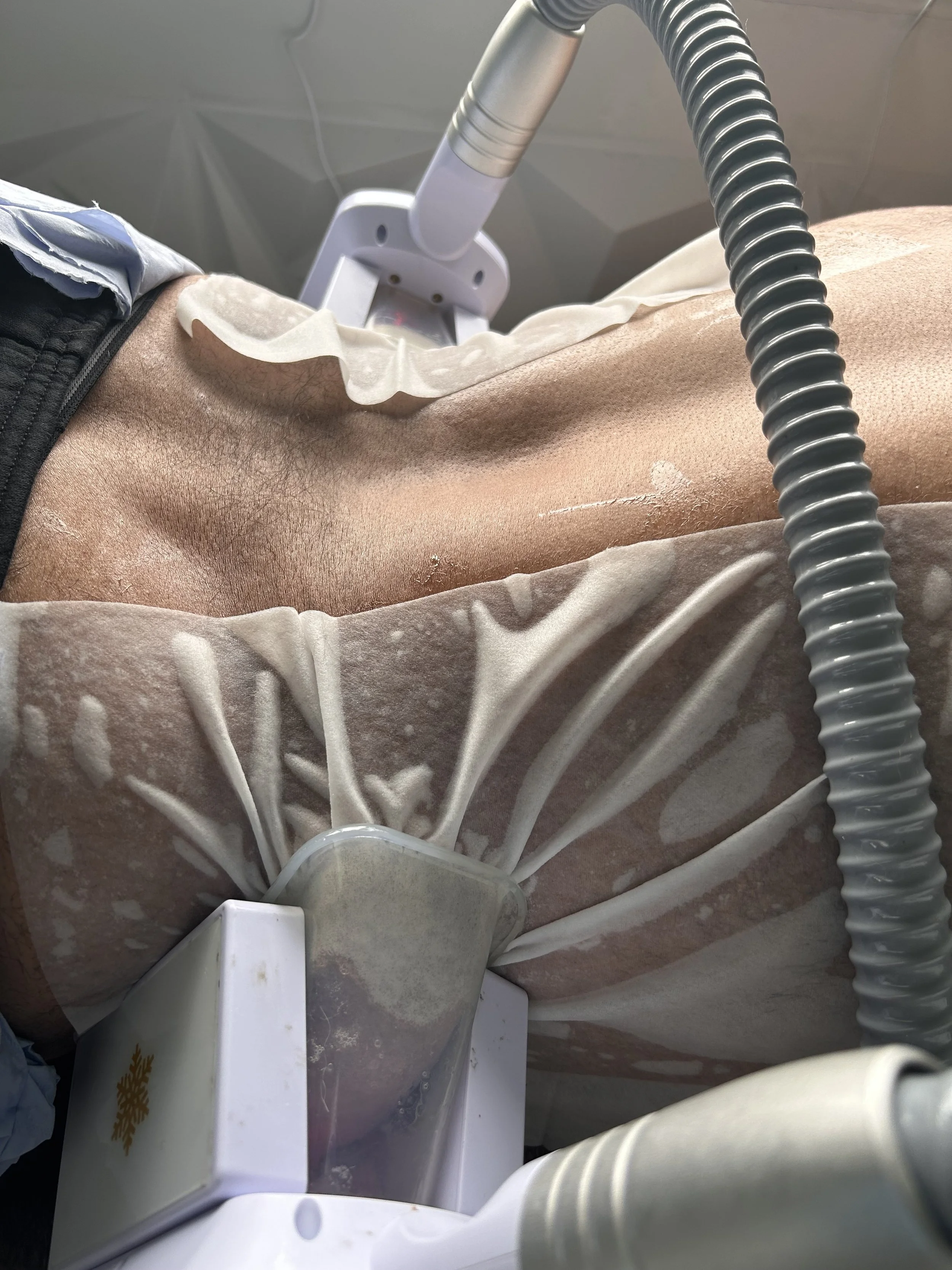Cryolipolysis is a term used for fat freezing. This is a non-invasive alternative to liposuction. What it does is target those localised areas that you wish to treat to kill off the fat cells that lie beneath the skin. You can lose up to 40% of fat in the treated area within 12 weeks.